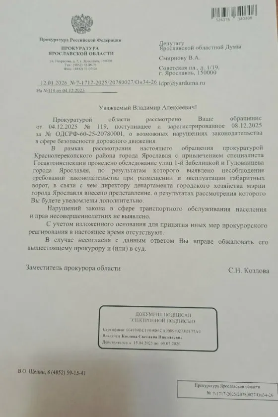 Также депутат областной Думы прикрепил фотографию с ответом прокуратуры. В тексте говорится, что прокуратура Красноперекопского района Ярославля с привлечением специалиста Госавтоинспекции провела обследование улиц 1-Й Забелицкой и Гудованцева.