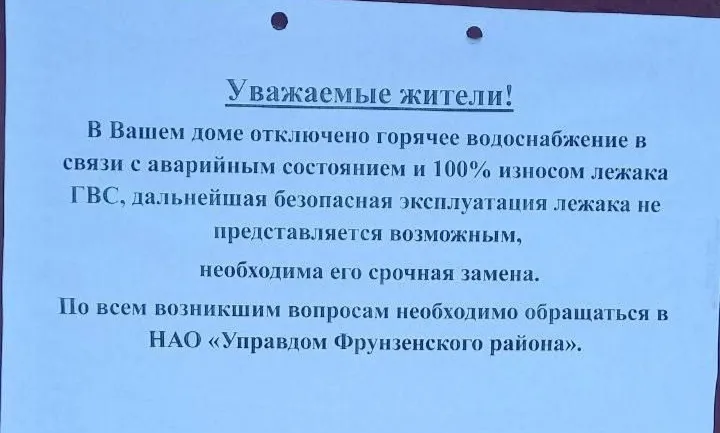 "Сегодня на Дружной, 1 повесили объявления о том, что не будет горячей воды в связи со 100℅ износом лежаков, без указания сроков ремонта и обратного включения ГВС. НАО Управдом Фрунзенского района отказывается делать ремонт - якобы это капитальный ремонт и нужно обрашаться в региональный фонд капремонта, где нам сказали, что мы в графике только на 2026-2028 год только!", - написала женщина и прикрепила фотографию объявления.
