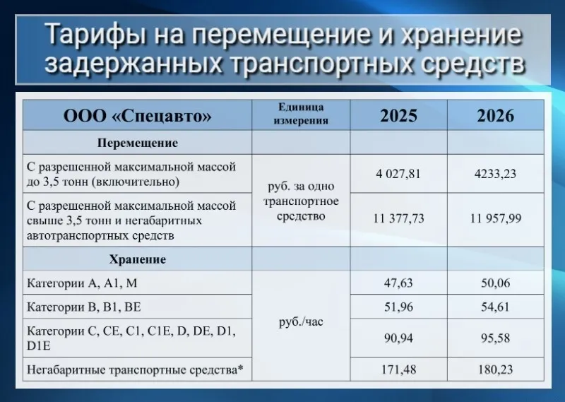 По информации регионального министерства тарифного регулирования с 1 января вступили в силу новые правила. Цены эвакуации и хранения задержанных автомобилей выросли на 5,1% — именно столько составляет индекс потребительских цен. Предусмотрены действующими договорами, заключенными по итогам конкурсов.
