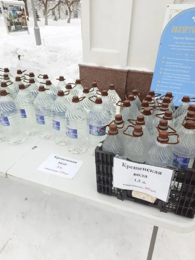 Также на территории монастыря подготовили бутылки со святой водой, которые можно было забрать за пожертвование. Размер пожертвования зависил от объёма тары.