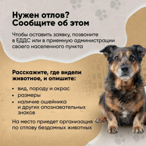 При обращении необходимо указать место обнаружения животного и предоставить описание: вид, породу, окрас, размеры, а также наличие ошейника или других опознавательных знаков. После получения заявки на указанный адрес выедет специализированная организация.