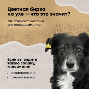 Карантинный период в приюте составляет 25 дней. Цветная бирка на ухе означает, что собака уже прошла через систему отлова и имеет все необходимые прививки.