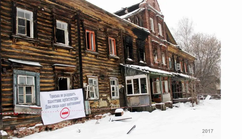 Здание давно находится в аварийном состоянии. По словам местных жителей и градозащитников, дом уже около десяти лет стоит без крыши и постепенно разрушается.