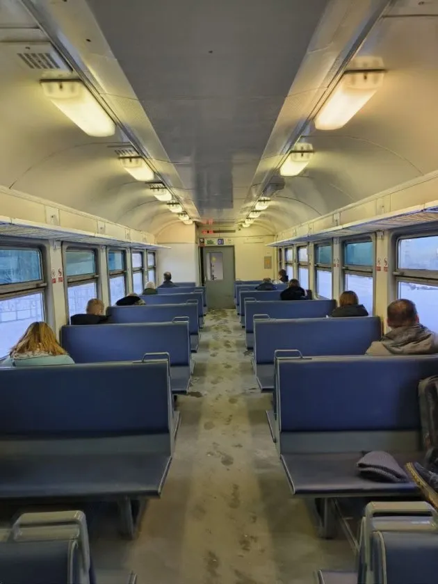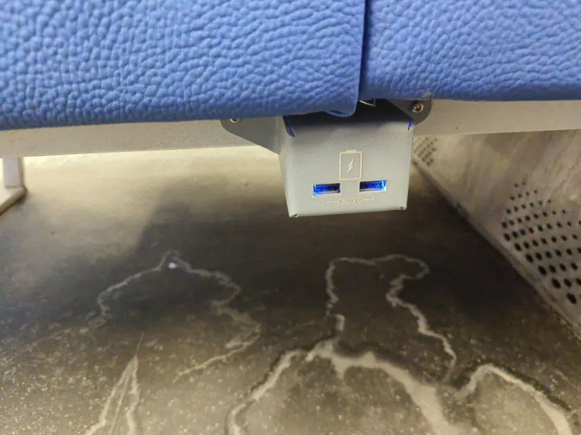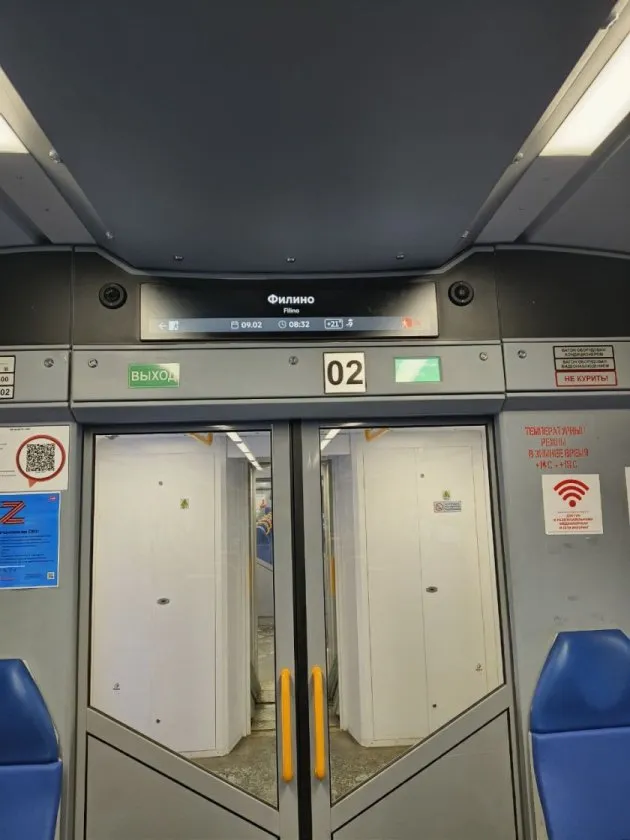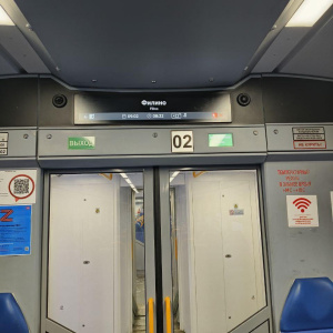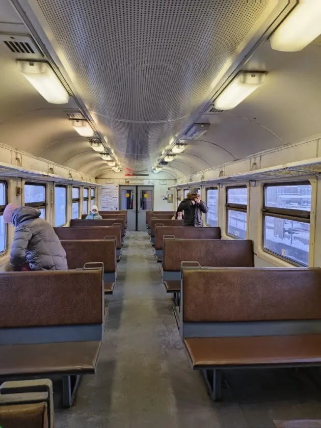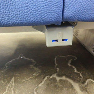 В этот раз нас ждал почти новый электропоезд — современный салон, мягкие кресла, розетки для зарядки телефонов. В вагоне висела табличка с информацией о доступе к развлекательному медиапорталу и сети интернет.