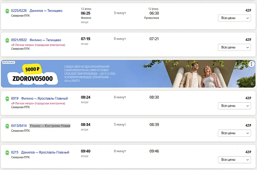 На маршруте действует единый тариф — 42 рубля за поездку в пригородных поездах в черте города. Но есть нюанс: если касса работает, а билет вы покупаете уже в вагоне, к стоимости добавляется комиссионный сбор 30 рублей, то есть поездка обойдётся в 72 рубля.