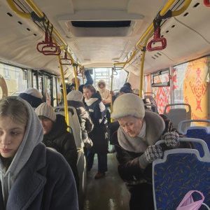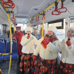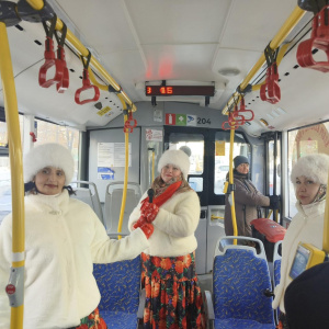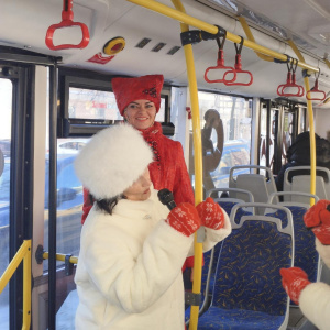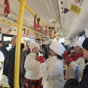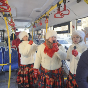 Обычный рейс в разгар рабочего дня превращается в небольшой концерт прямо на ходу. В этот раз в салоне выступали артистки из ДК «Гамма» на Резинотехнике: в платьях с микрофонами и колонкой они исполняли русские народные песни — от задорных куплетов до спокойных лирических мелодий.