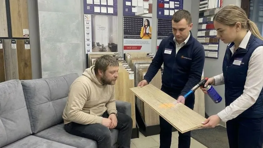 Сначала его начали тереть металлической щёткой. Я напрягся. Потом без пафоса опустили в кипяток. Достали. Ноль реакции. Ни волн, ни вздутия. А потом взяли газовую горелку и открытое пламя никак не повредило напольное покрытие. Тут я уже решил, что это перебор. Но и огонь ему не сделал ничего.
