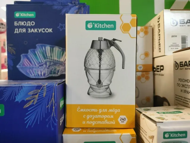 Практичный кухонный аксессуар: помогает аккуратно наливать мёд без капель и липких следов, а подставка защищает поверхность стола и упрощает использование.