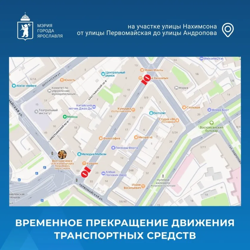 Прекращение движения транспорта по улице Нахимсона на участке от улицы Первомайская до улицы Андропова продлено до 1 апреля. Об этом жителям и гостям Ярославля рассказали в мэрии города.