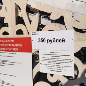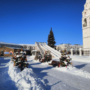 Вторая официальная детская горка расположена на Советской площади, рядом с катком и ярмарочными домиками. Здесь сам спуск бесплатный, платить нужно только за прокат тюбинга. На стендах указано, что катание на аттракционе «тюбинг‑кросс» стоит 350 рублей за короткий цикл спусков, а прокат тюбинга на всесезонную горку — тоже 350 рублей, при этом время катания не ограничено; для многодетных, малоимущих семей и семей участников СВО действует льготный билет за 150 рублей.