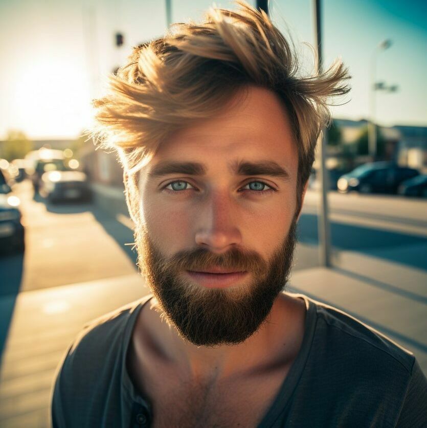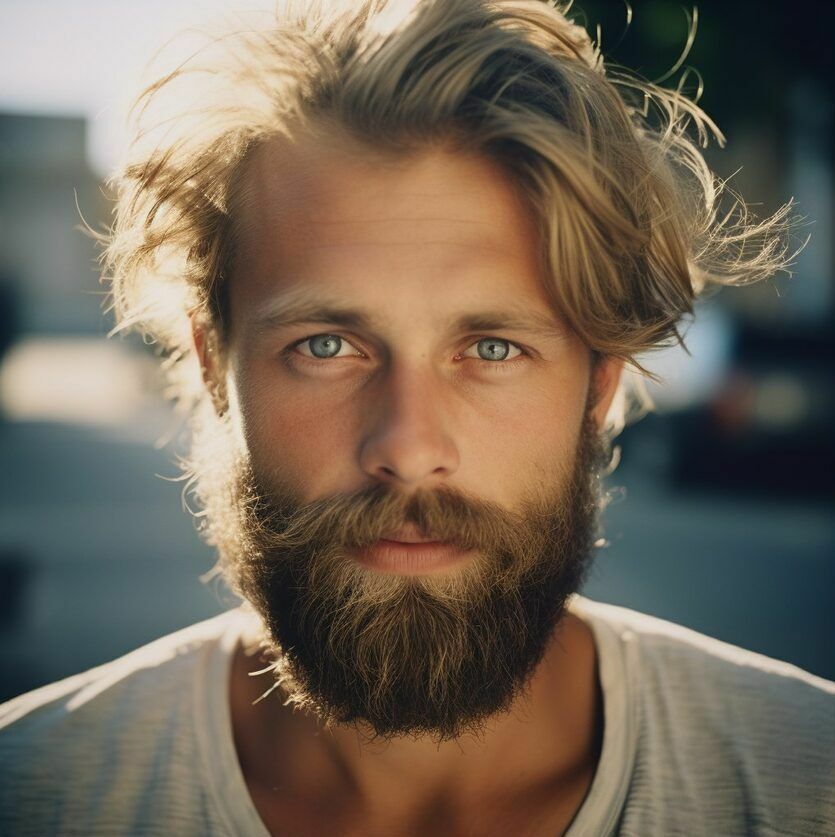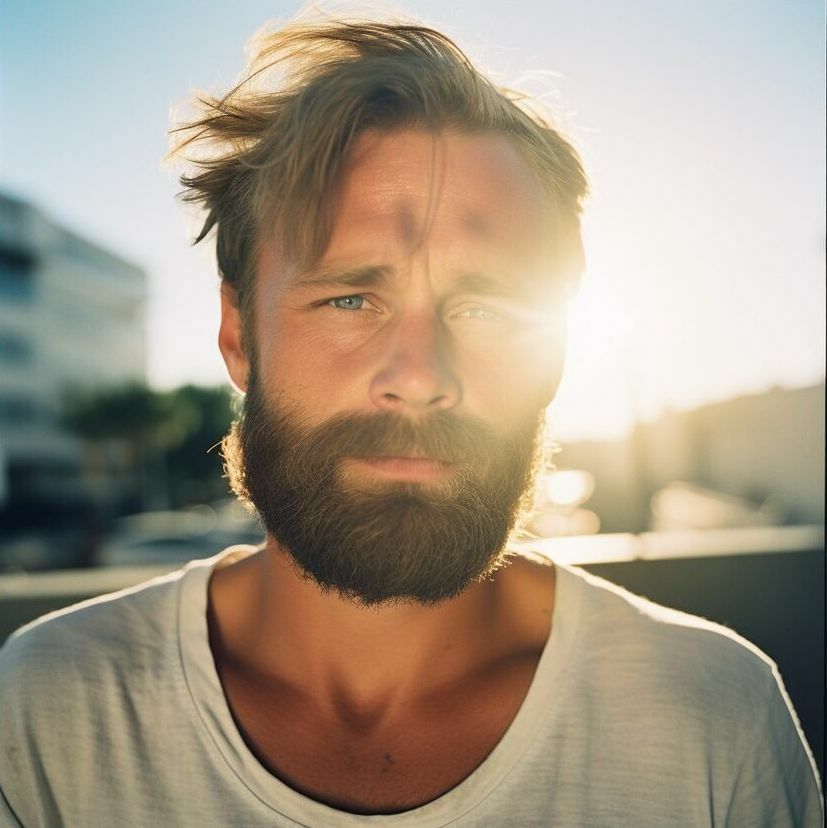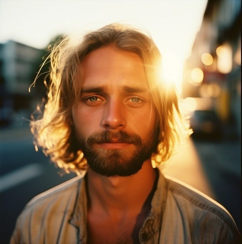 Пример: Фотография в уличном стиле молодого светловолосого парня с голубыми глазами и бородой, съемка на Polaroid, в лучах заходящего летнего солнца, крупный план, соотношение 1:1.